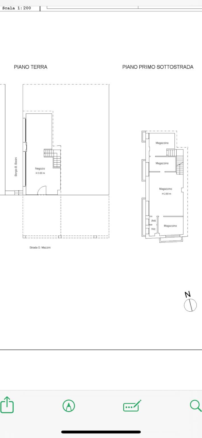 Affittiamo in via Mazzini, negozio ad angolo, con due vetrine, negozio di 44 mq su strada, e 60 mq di magazzini nel seminterrato. No canna fumaria